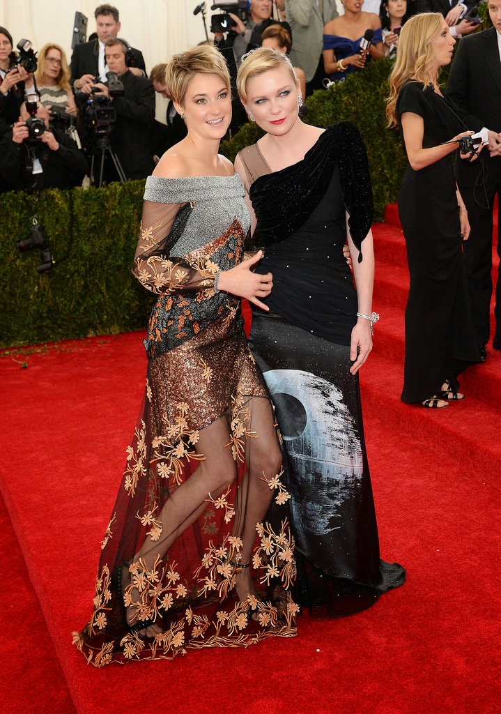 SHAILENE WOODLEY E KIRSTEN DUNST COM DOIS DOS PIORES LOOKS DA NOITE AMBOS DA GRIFE RODARTE.