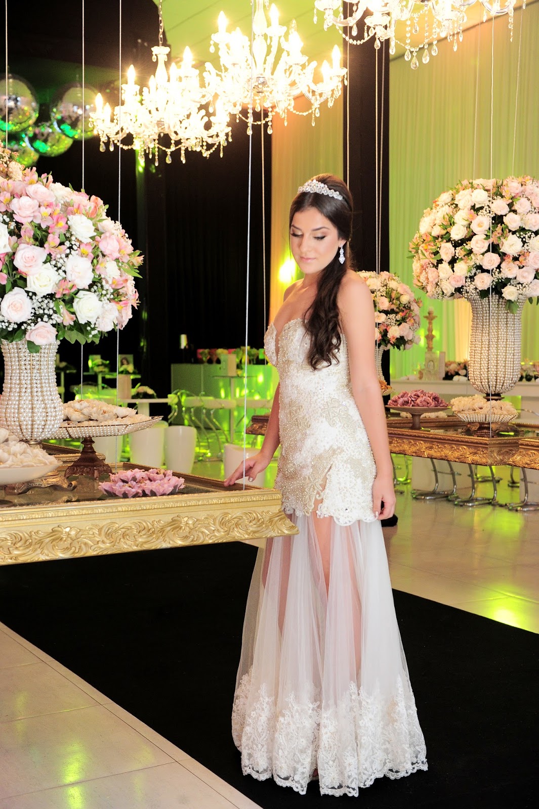 O MODELO QUE A DEBUTANTE OPTOU PARA A ENTRADA E A VALSA, FOI UM VESTIDO FEITO POR NOSSO DIRETOR DE ESTILO, EDUARDO MALTA, UM TOMARA QUE CAIA, TODO BORDADO COM SAIA REMOVÍVEL.