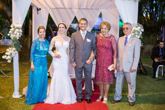 NOSSA NOIVA USOU UM MODELO SEREIA DE MANGAS E COM APLICAÇÕES DE RENDA. AS DAMAS TAMBÉM USARAM VESTIDOS ZEPHORA, BORDADOS COM PÉROLAS.