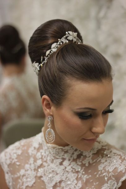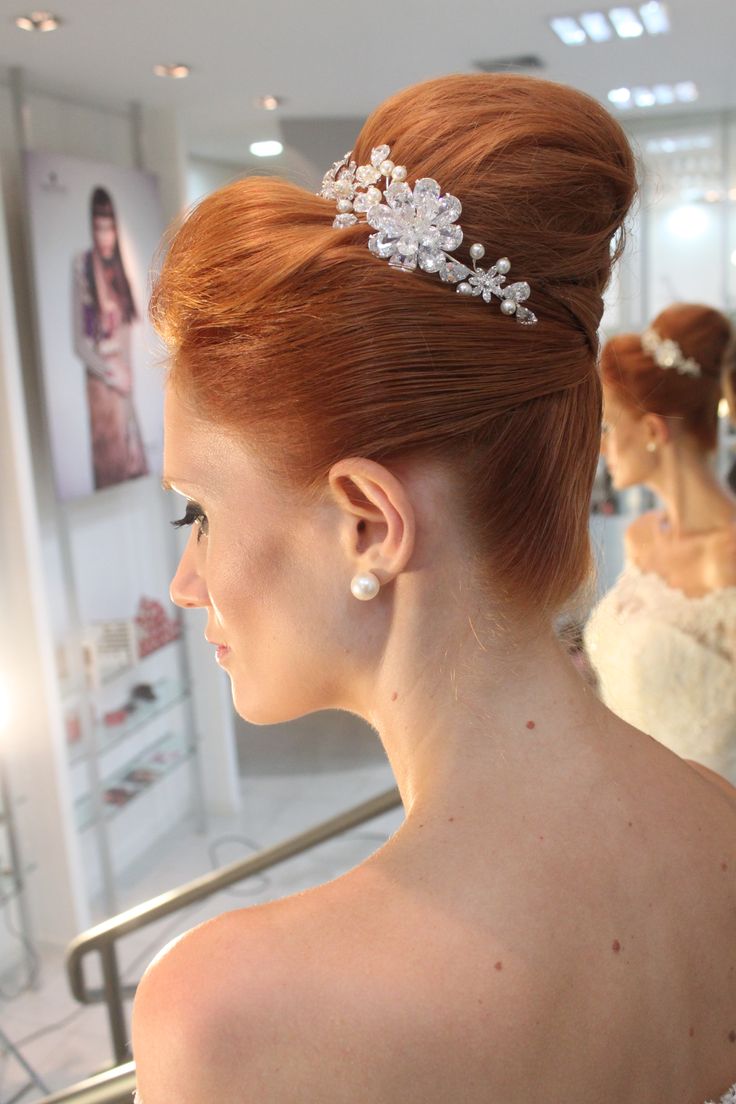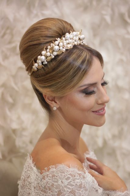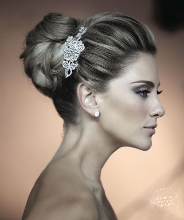 Pode ser pequeno, grande, alto ou baixo. O importante é você se sentir bem e o volume se adequar ao seu formato de rosto! É o estilo mais tradicional e imponente de todos! Também é considerado o penteado mais seguro para noiva já que sua duração costuma ser maior que os outros!