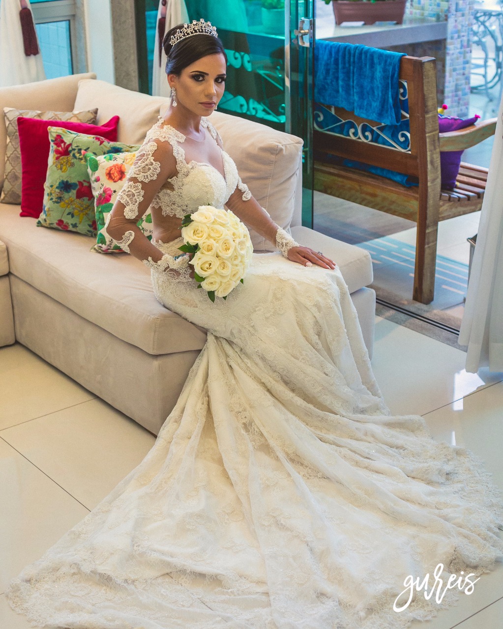 Já a princesa Michele, optou um modelo da nossa linha Premium, desenvolvido no Ateliê Zephora Alta Costura e assinado pelo nosso diretor criativo Eduardo Malta. O vestido na cor off white é sereia, de mangas longas, com recorte em transparências que deixa a silhueta moderna, com mix de rendas francesas rebordadas em pérolas e cristais, criando uma textura super luxuosa.
