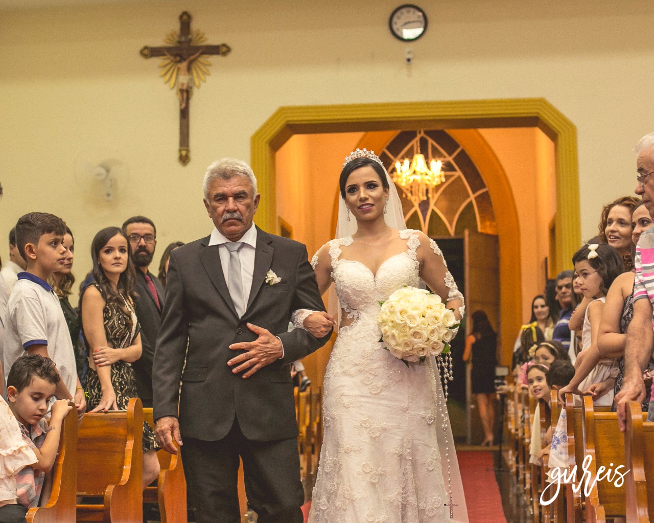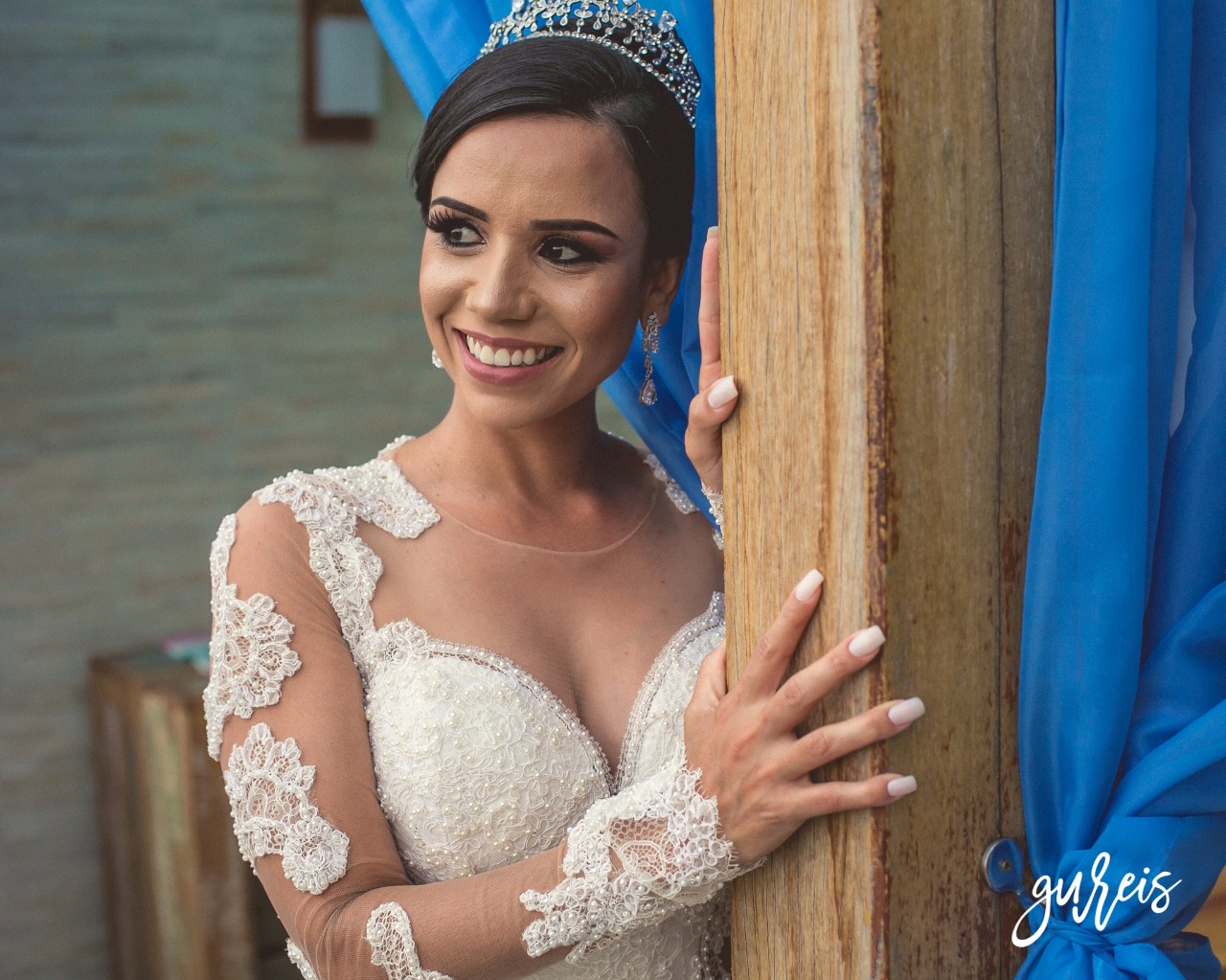 A noivinha Mônica, escolheu um lindo vestido da nossa linha de designers internacionais. O modelo off white é ombro a ombro com transparência no colo e nas costas, com detalhe de cinto em cristais, todo em renda francesa rebordada em pedrarias finas, com corte sereia e cauda.