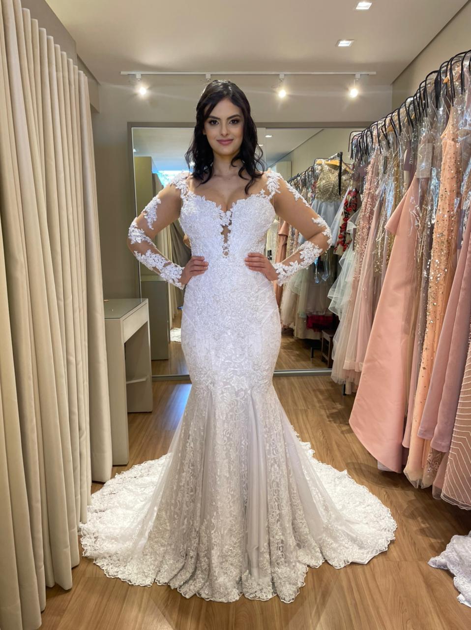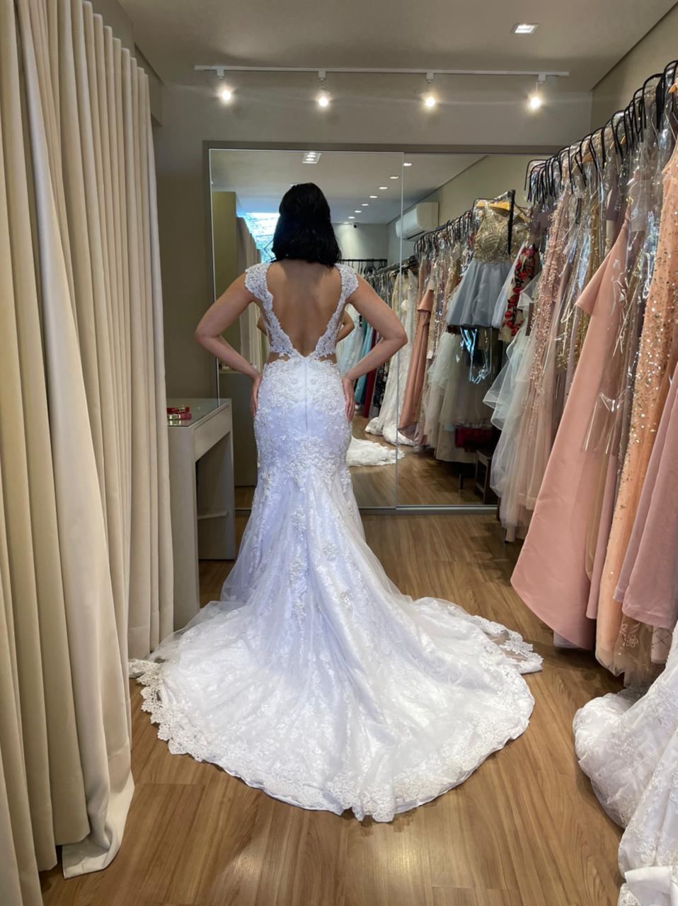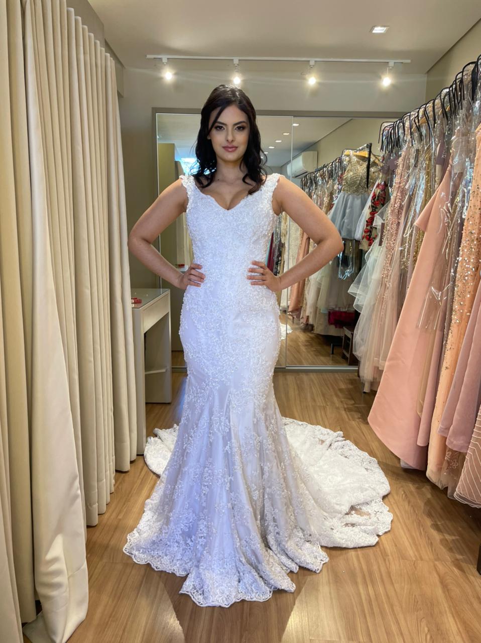 - Os vestidos de noiva vão da numeração 38 a 40.