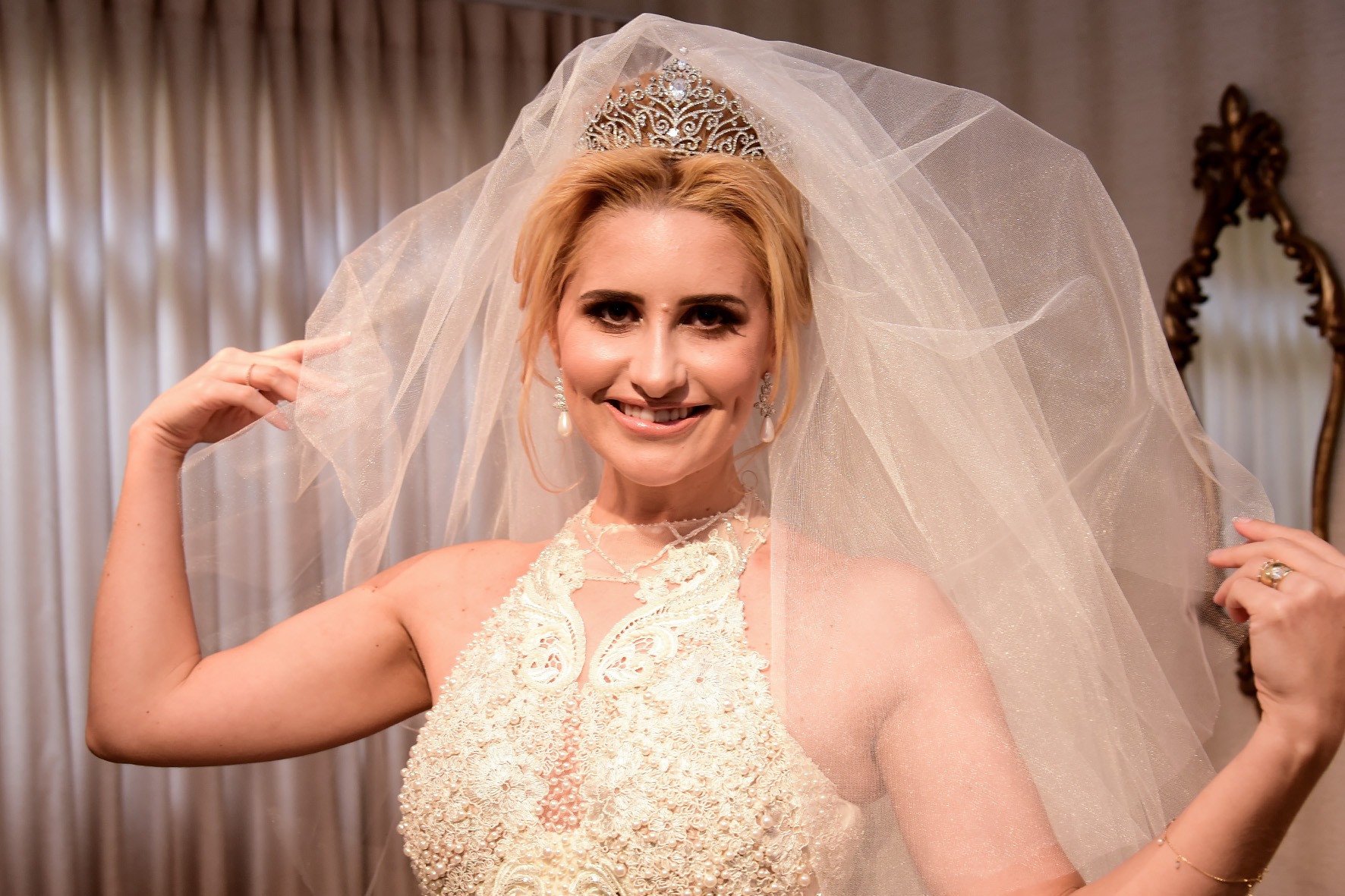 Um dos destaques do casamento foi o véu de 10 metros feito especialmente para noiva acompanhado da coroa. O vestido escolhido por Ludimilla era off White com modelagem sereia. A peça em tule possui aplicação de renda guipir e mariscot francesa rebordada em pérolas e cristais e uma cava americana com gola.