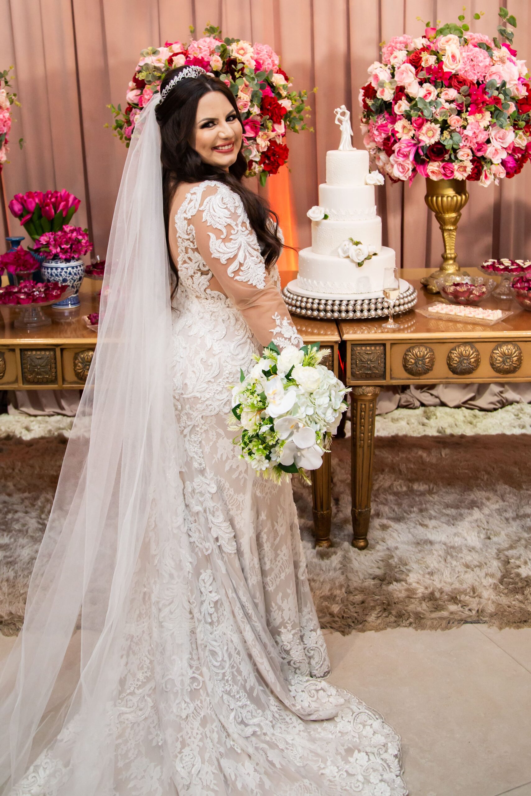A noiva escolheu um modelo com mangas longas, decote v frente e costas, forro nude, renda chantilly francesa, aplicações em arabescos, barrado floral e bordado em cristais e vidrilhos transparentes. Com esses componentes temos uma joia que orna perfeitamente com a beleza dela.
