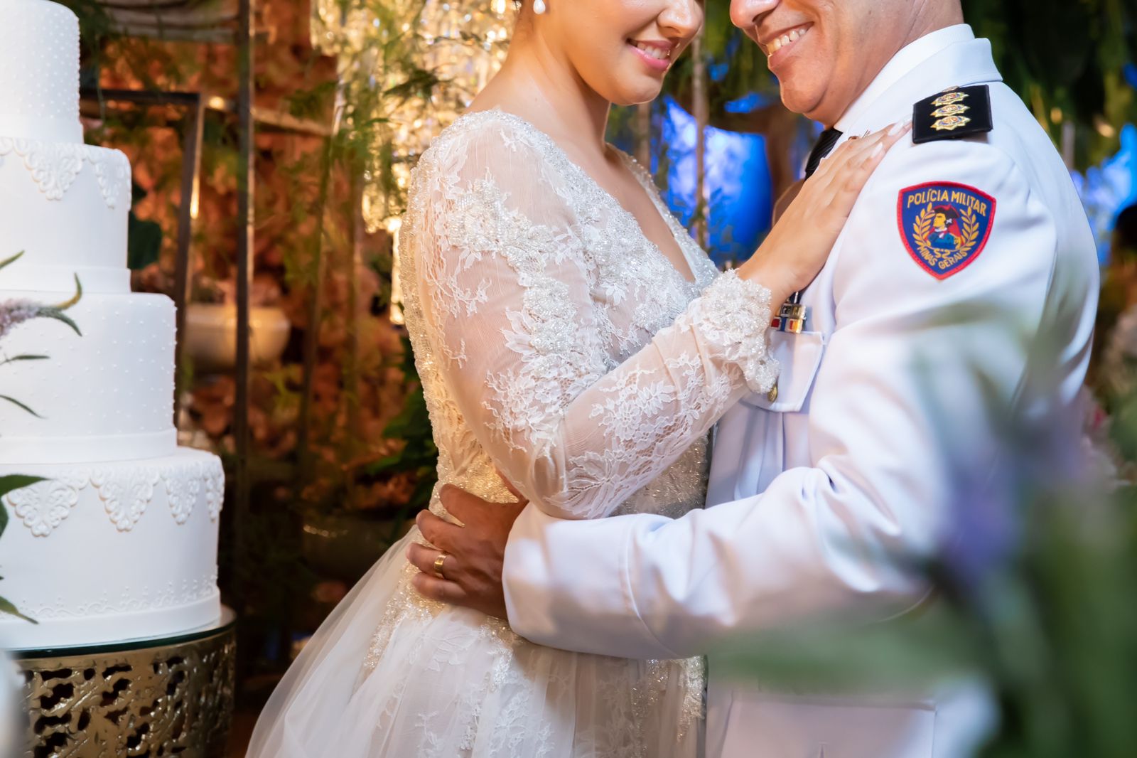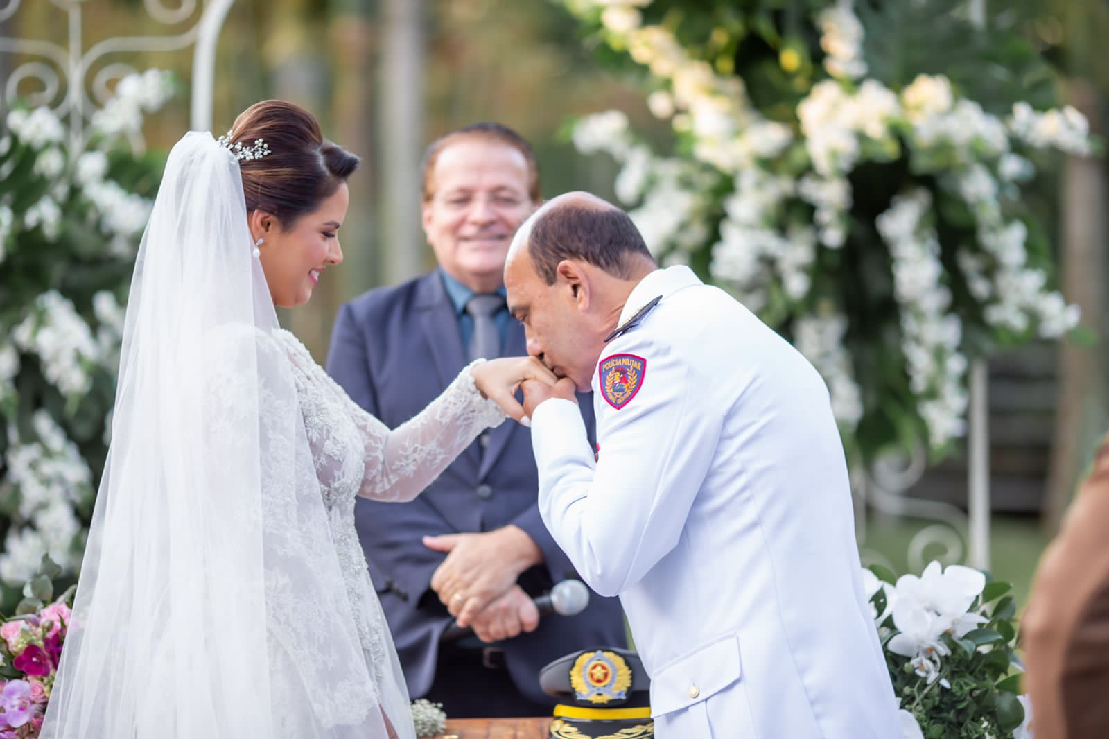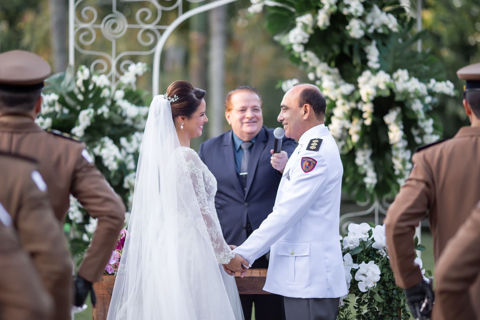 Um casamento militar que teve a participação de vários colegas de trabalho do noivo, compondo a entrada do cortejo, que trouxe todo o encanto para o momento, formando uma guarda de honra, com todos fardados trazendo um grande significado e representando a história do casal. Julia nos escreveu com detalhes como foi o processo de escolhas para esse momento: