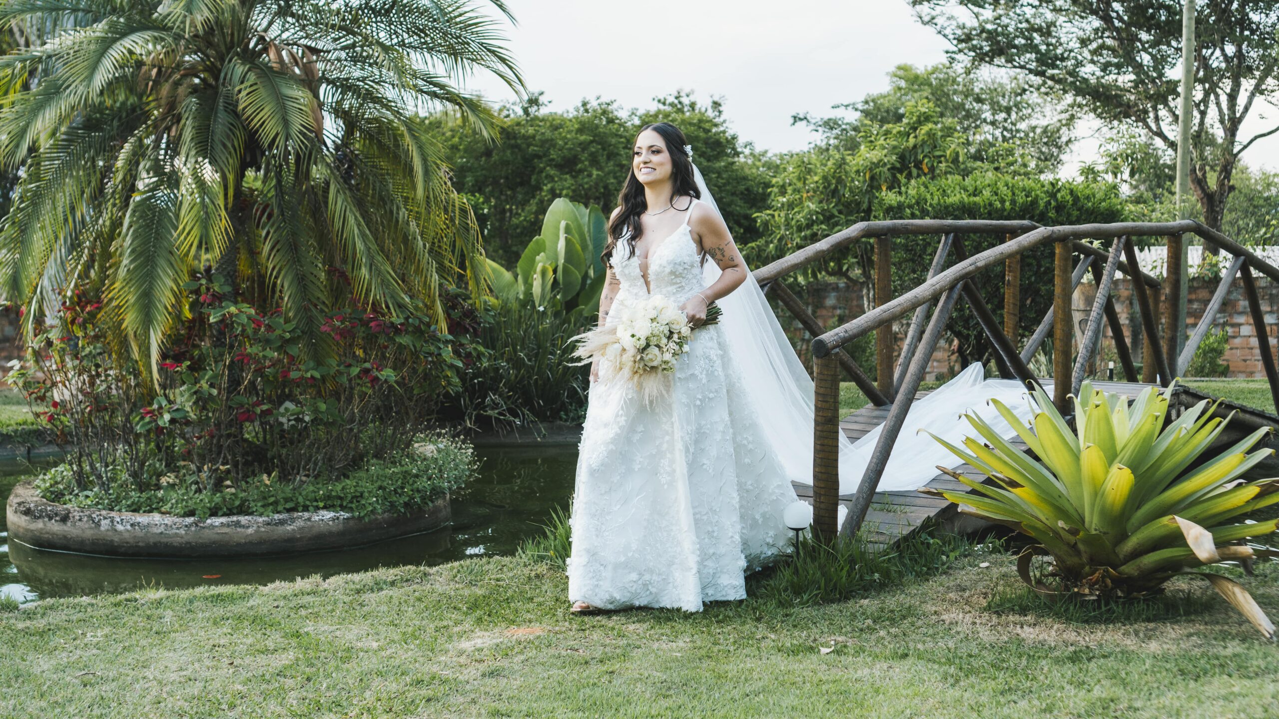 Estar vestida com o que sempre sonhou é realmente indescritível. Yasmin escolheu um vestido de noiva com alças duplas e finas, decote v frente realçando o colo, modelo evasê todo em renda, com aplicações de flores 3D, que trouxe ainda mais personalidade para o casamento que aconteceu ao ar livre.