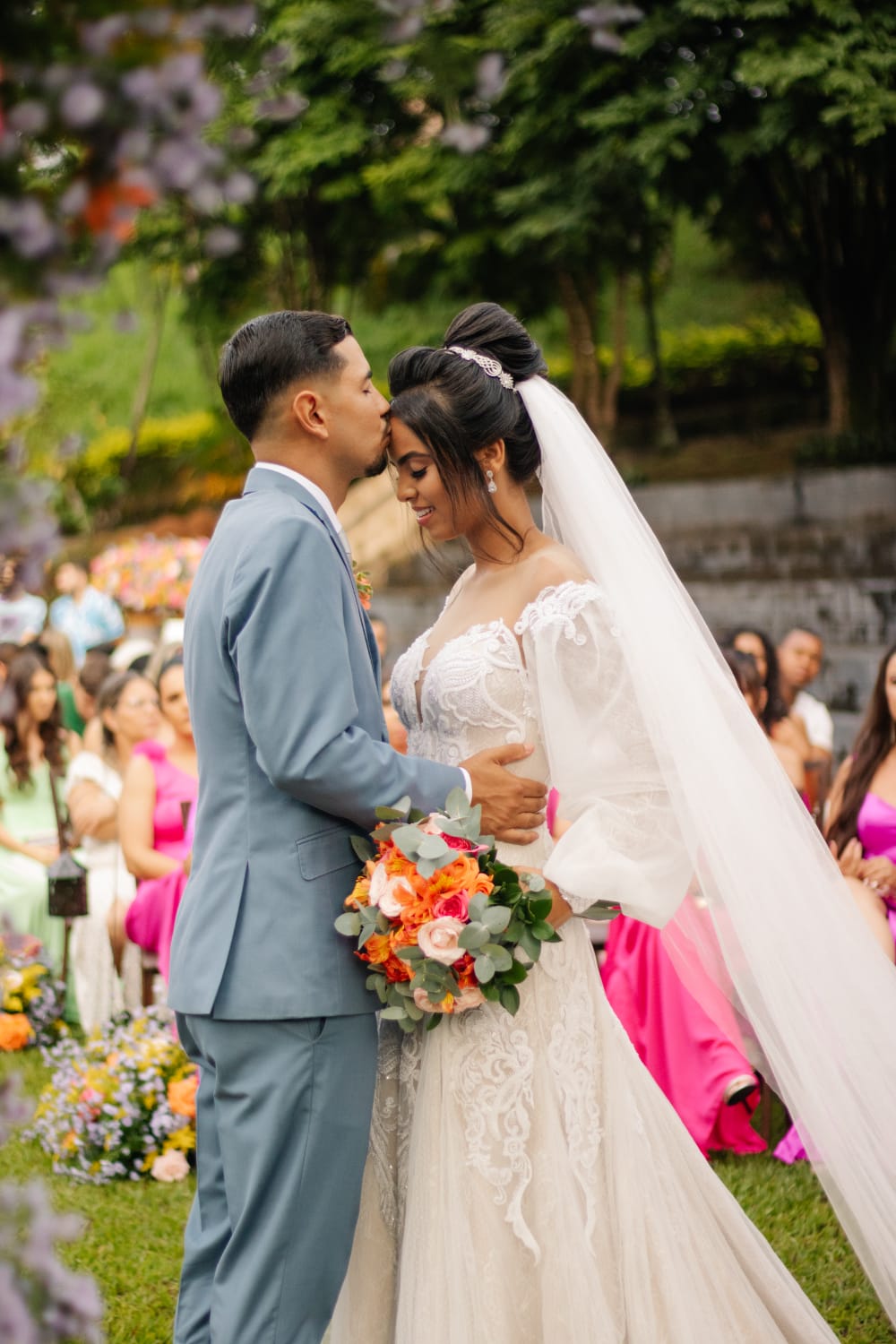 O cenário complementou de forma delicada a escolha de Raissa. Em uma cerimônia a céu aberto, as árvores e as flores coloridas deram um tom leve e alegre ao cenário, refletindo a felicidade dos noivos.