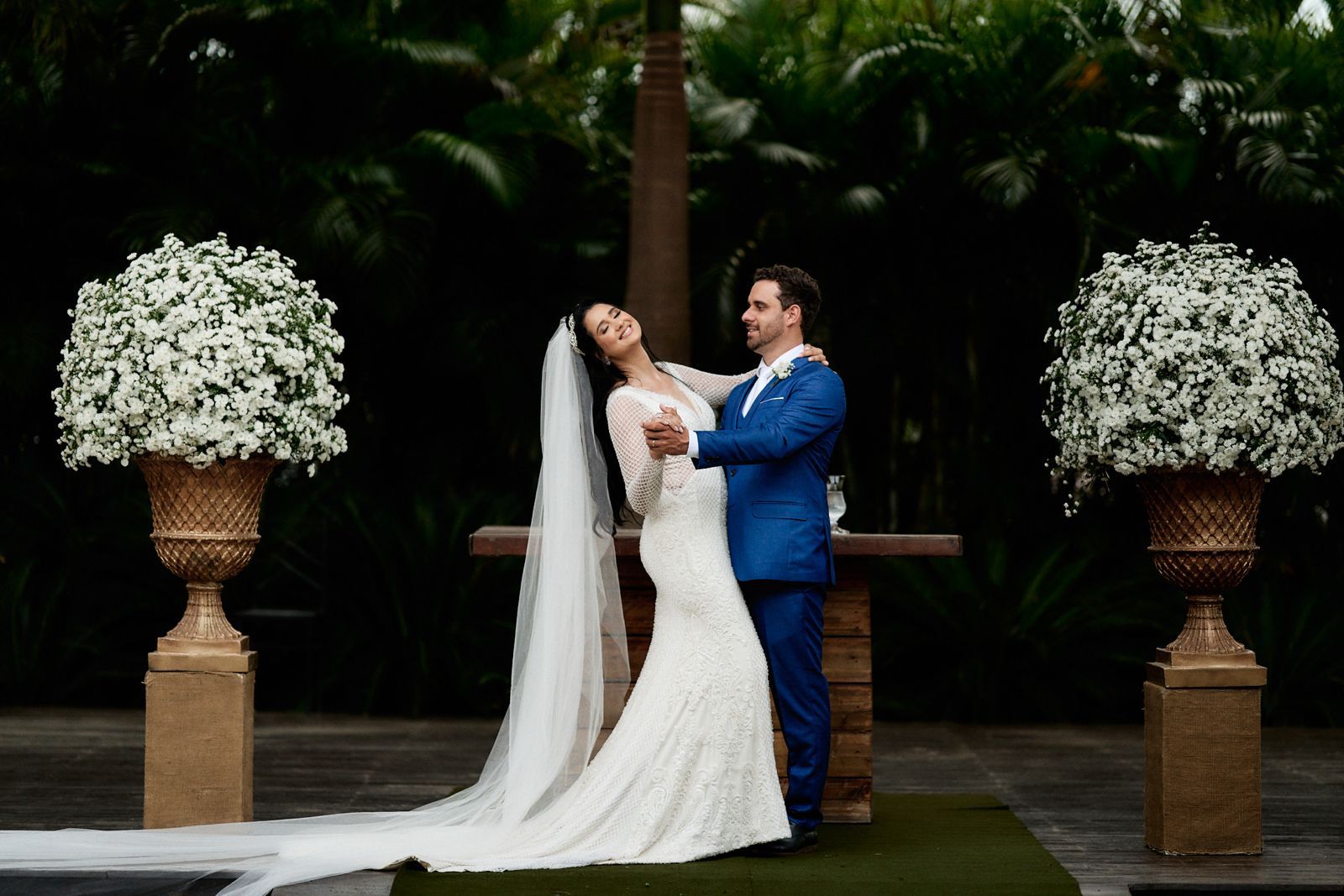 As árvores foram parte essencial da decoração clássica e minimalista, composta com delicados arranjos de flores brancas, que deixou o momento ainda mais especial e intimista.