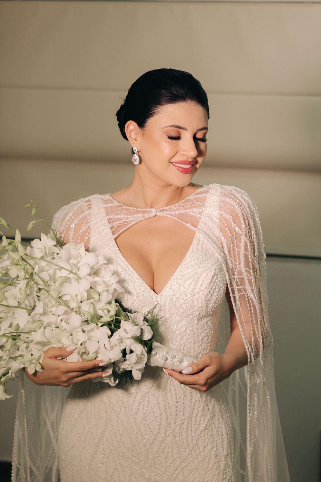 O vestido noiva dos sonhos de Allana traduzia sua essência em cada detalhe. Ajustado suavemente ao corpo, ele realçava sua silhueta com elegância, enquanto as costas nuas traziam um toque de sensualidade. O bordado em risco – feito à mão – criava uma textura sofisticada sobre o tecido, conferindo um brilho sutil, como se ele surgisse com os movimentos da noiva. O toque final – e verdadeiro charme do vestido – era a capa removível, também bordada em pedraria e com o mesmo risco do vestido, criando um visual impactante e sofisticado.