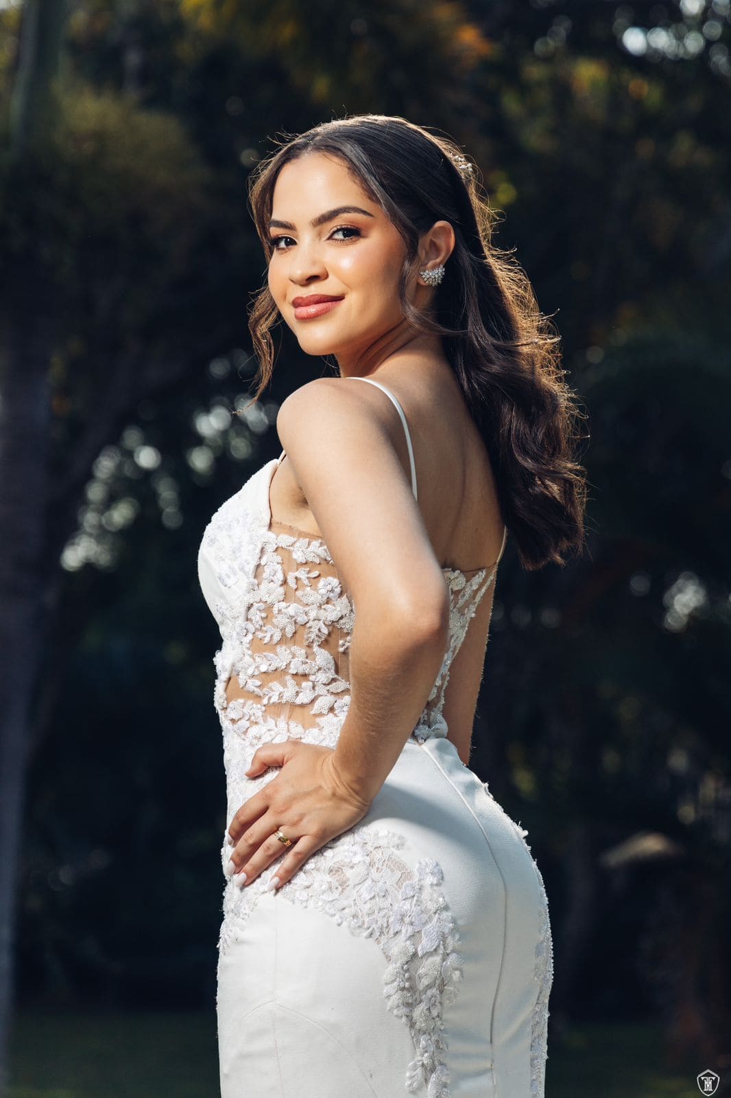 Para seu grande dia, Ana Vitória escolheu um vestido sereia impecável, confeccionado em alfaiataria com aplicações de renda. A silhueta ajustada valorizava suas curvas com elegância, enquanto os recortes em transparência e as flores aplicadas traziam um toque de romantismo e sensualidade.