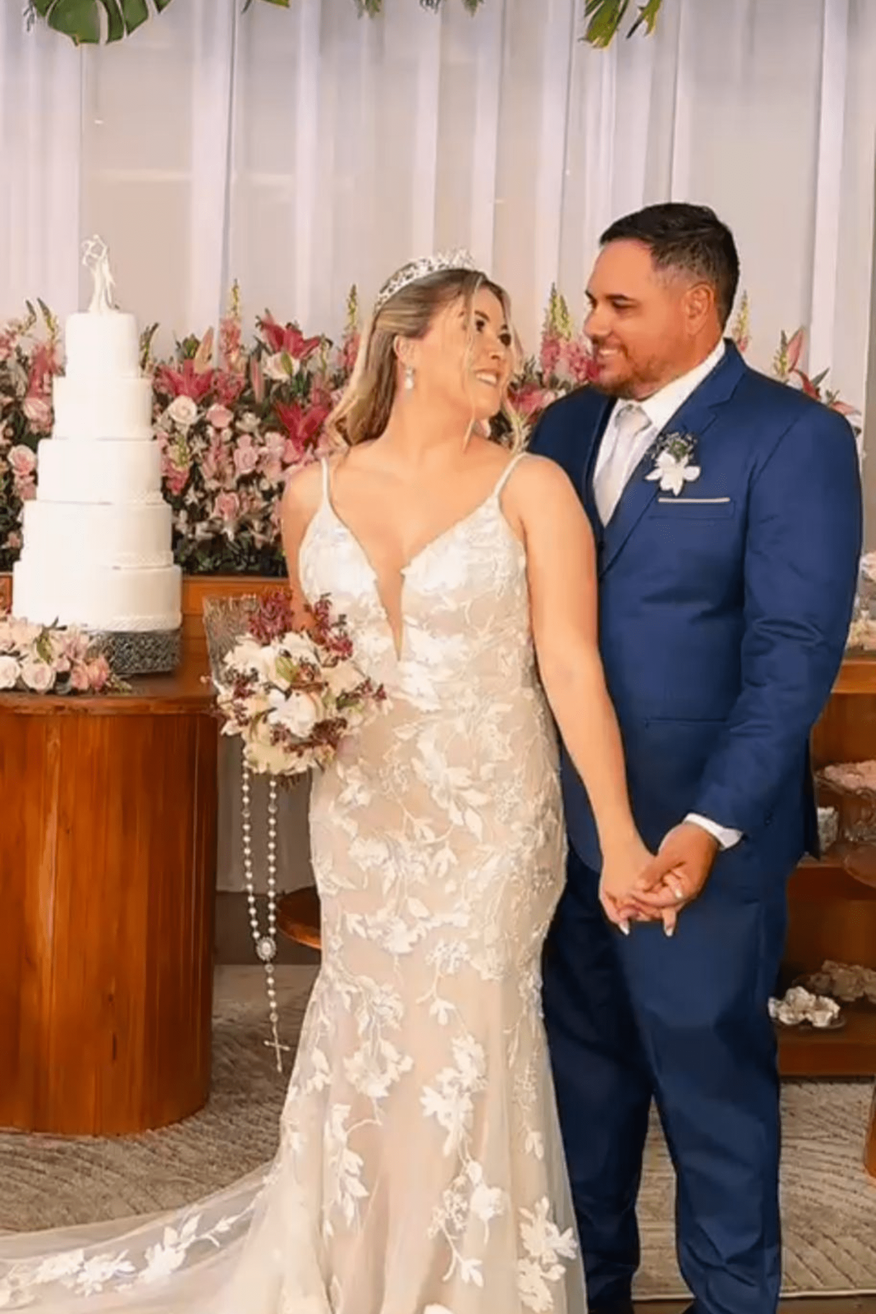 Palloma estava deslumbrante com seu vestido de noiva sereia, que evidenciava as curvas do seu corpo, com alças finas, decote em “V” na frente e nas costas, aplicações de flores e arabescos, cauda dupla e uma mantilha extremamente delicada. Não tinha como conter as lágrimas, o noivo se emocionou ao vê-la, o que tornou o encontro do casal no altar ainda mais especial.
