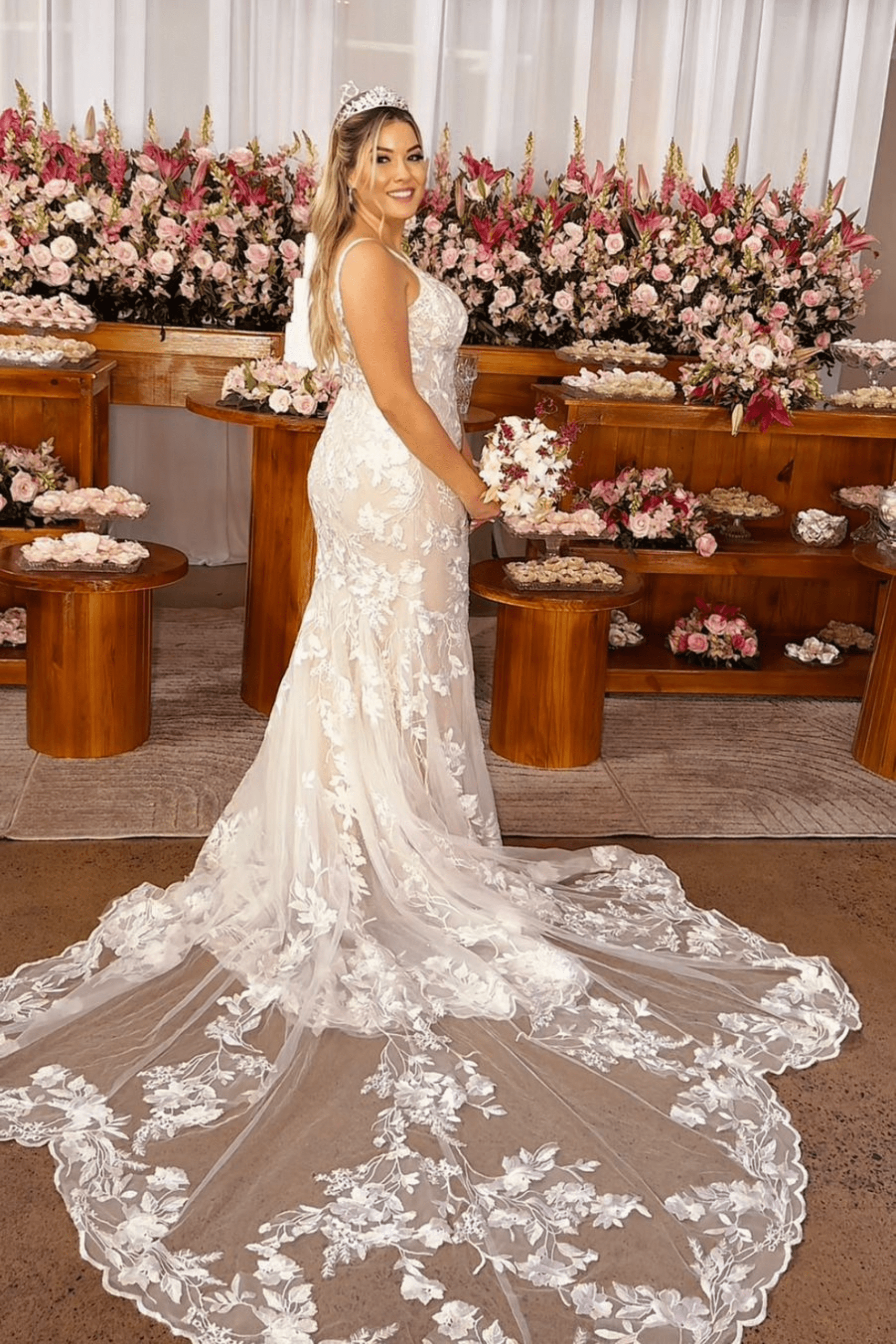O atendimento da minha consultora foi incrível, ela é diferenciada! Me ajudou com a mantilha, que, para mim, combinou perfeitamente com as flores do vestido.