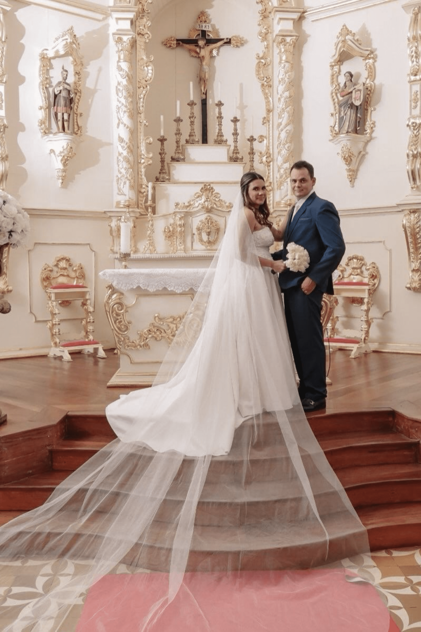 Ela selecionou um vestido de noiva alfaiataria, evasê, tomara que caia, com aplicações de rendas florais e flores 3D por todo o busto e salpicadas pela saia. Vestida pelo seu sonho, estava prestes a encontrar Renan no altar, segurando seu buquê de rosas brancas. O dia 21-12-2024 foi extraordinário e emocionante.