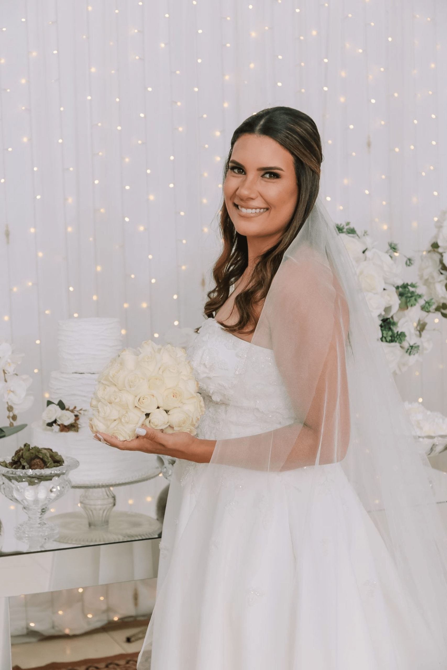 “A escolha do vestido foi muito fácil. Queria um vestido tomara que caia com poucos detalhes e véu. Chegando à Zephora e explicando para minha consultora como eu queria, me trouxeram ele e foi amor à primeira vista.