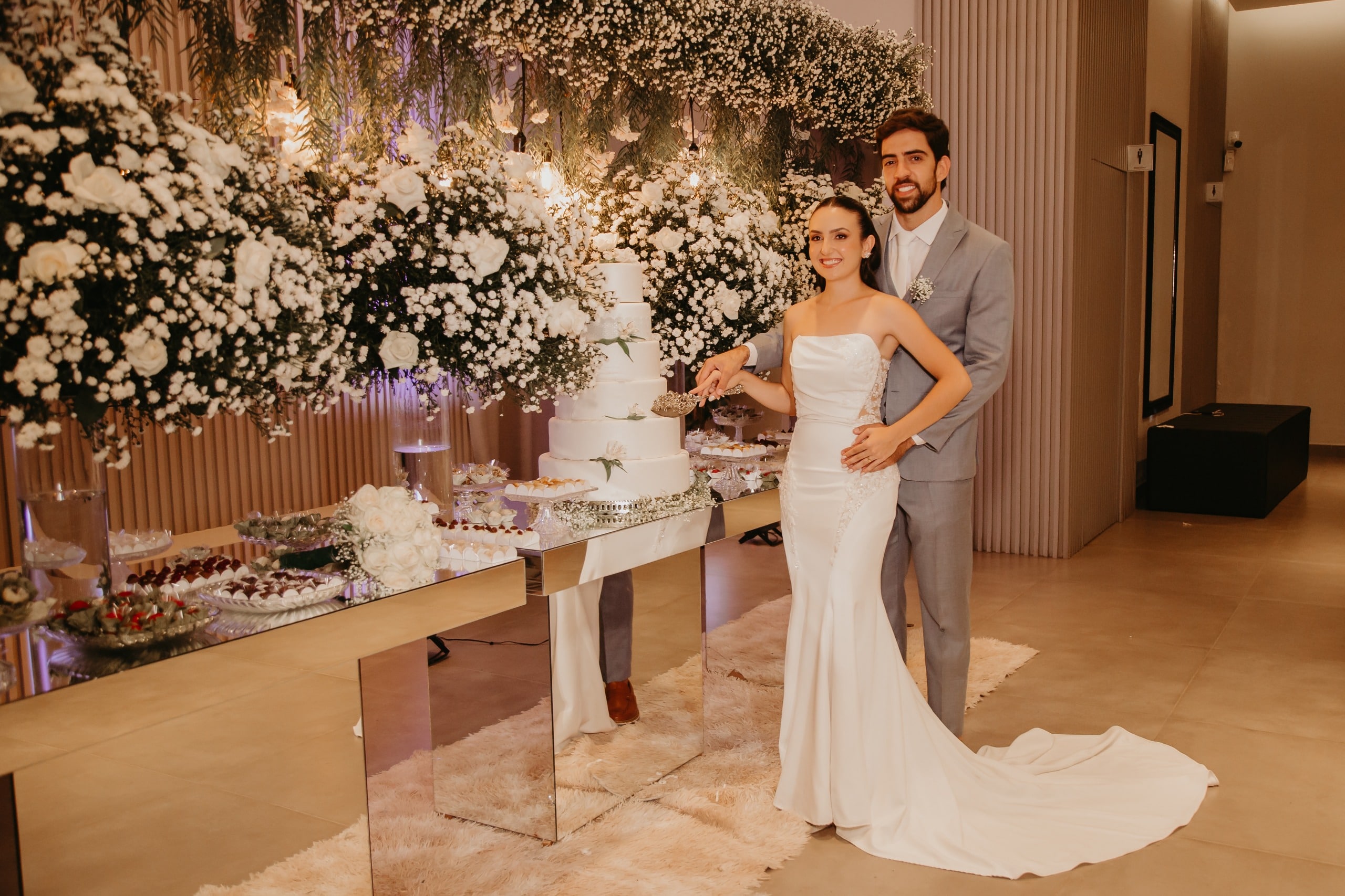 Na celebração, a noiva entrou na igreja de mãos dadas com seus pais, rumo ao encontro de Gabriel, que demonstrava toda a sua felicidade em um sorriso radiante. Cada detalhe do casamento transmitia emoção: a alegria dos convidados, o carinho dos familiares e a atmosfera única desse dia tão esperado.
