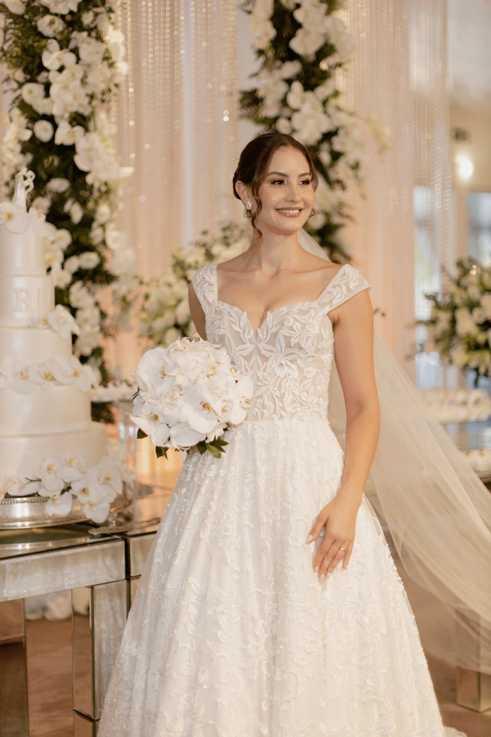 O vestido de noiva, ombro a ombro, com decote V discreto, trazia charme e delicadeza em cada detalhe. A renda, aplicada por todo o vestido e rebordada à mão, dava o toque final à sua volumosa saia, criando uma composição elegante e atemporal.