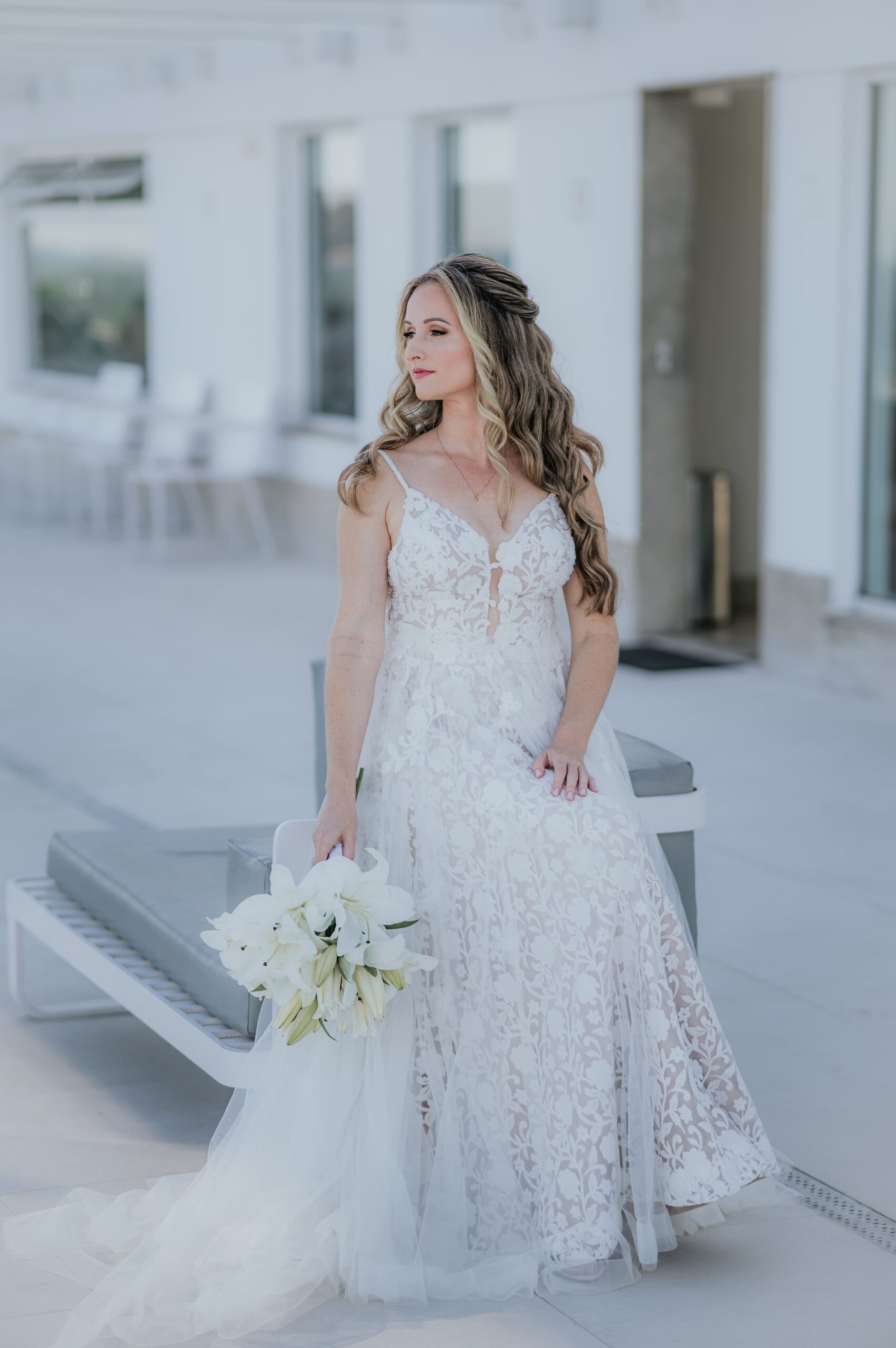 Vanessa estava radiante. A composição perfeita se completou com buquê de lírios brancos, cabelos soltos e maquiagem leve, realçando sua beleza natural.
