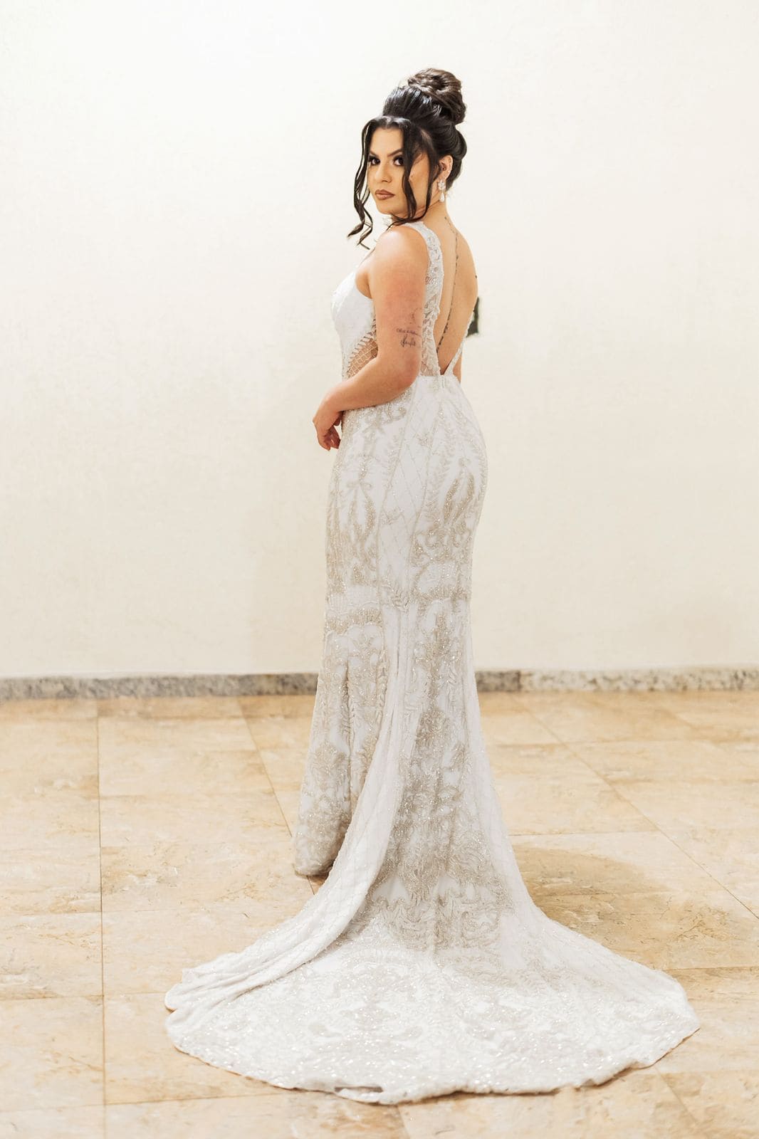 Ela escolheu um vestido de noiva no estilo sereia, justo ao corpo, valorizando suas curvas e silhueta. O modelo apresenta decote profundo em “V” na frente e nas costas, transparências laterais que afinam a cintura e é inteiramente bordado com vidrilhos luxuosos e importados, formando desenhos de arabescos e flores desde o decote até a barra, com um acabamento rico e minucioso.