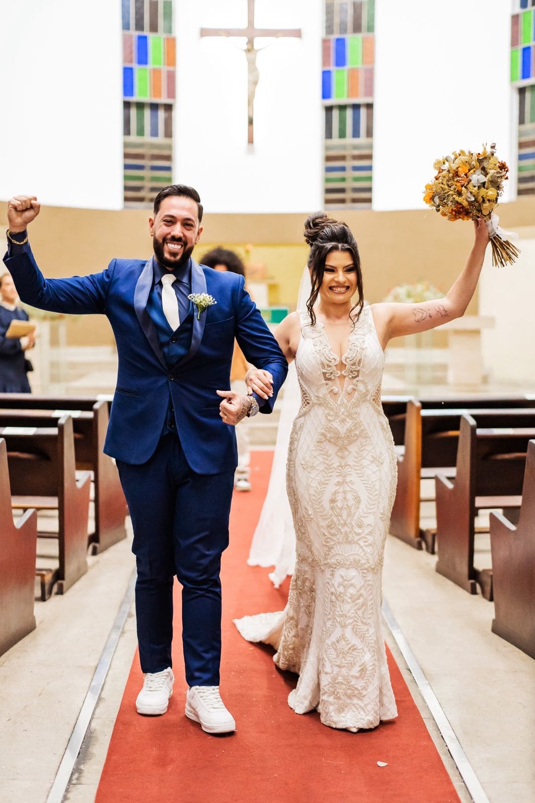 Podemos dizer que Thais transmitia sofisticação, luxo e elegância com o modelo escolhido. Rafael, por sua vez, optou por um terno azul escuro, criando a combinação perfeita ao lado de sua noiva no altar.